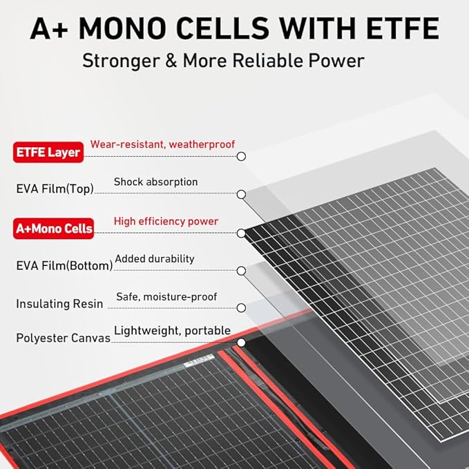 - 【COMPACT SIZE, EASY TO CARRY】 Folds down to 18.9×26×0.5in and weighs just 5.3lb, making this 100W panel lightweight and convenient to pack, move, or mount for road trips, vans, and emergency backup.