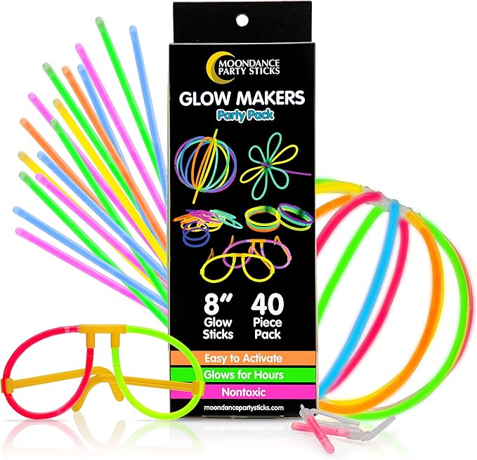 PartySticks Moondance Glow Sticks and Connectors - 40pk Glow in The Dark Party Favors with 16 Glow Sticks Party Decorations and 24 Connectors for Light Up Glasses, Glow Necklaces, Glow Bracelets