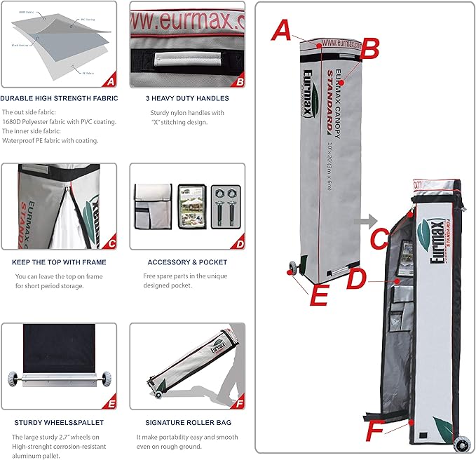 - The Rolling storage Bag: Eurmax unique L shaped roller bag is oversize designed, it is easy to put frame and top in the bag. Big 2. 7"Diameter wheels, heavy duty strong polyester, 2 layers fabric sewed, reinforced handles, all these makes the bag long lasting.