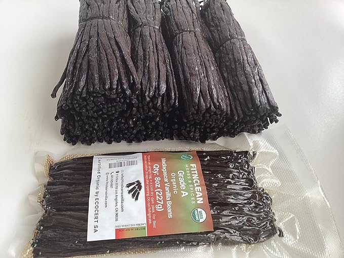 8oz Madagascar Organic Vanilla Beans Grade A. Certified USDA Organic. Fresh 6"-8" for Cooking, Baking and Extract by FITNCLEAN VANILLA| 0.5 lb Bulk NON-GMO Whole Bourbon Gourmet Pods.