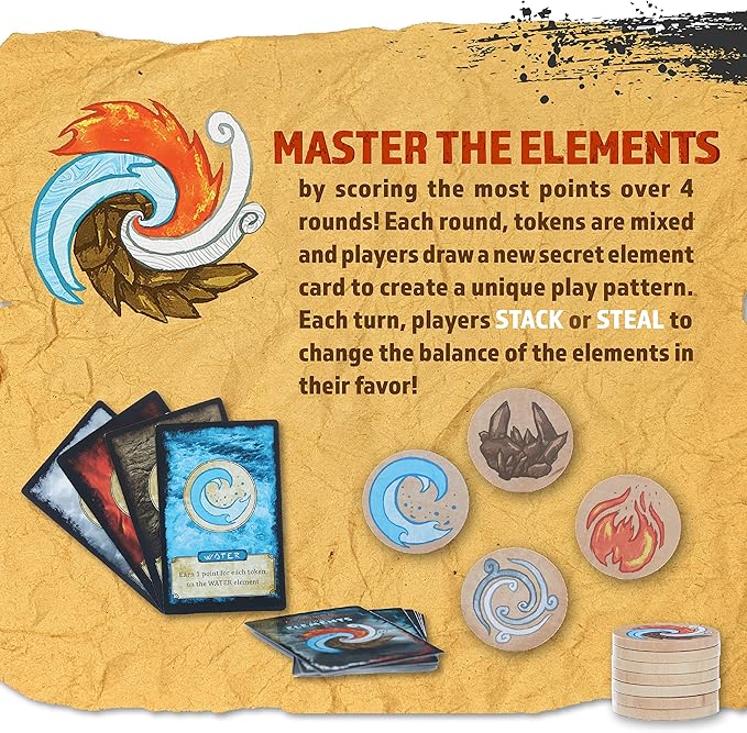 - STRATEGY & CHANCE: Develop unspoken alliances and avoid the schemes of others as you attempt to stack, steal and collect the most earth, wind, fire, or water tokens to conquer elements.