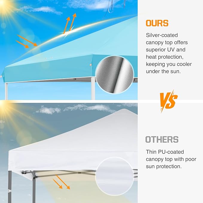 - HEAVY DUTY TOP WITH VENTED DESIGN: The EAGLE PEAK canopy features a CPAI-84 rated 150D silver-coated oxford top with double-stitched and heat-sealed seams for long lasting waterproof performance. This durable pop up canopy provides UPF 50+ sun protection and a large vent at the peak to release heat; ideal for staying cool at outdoor events, markets, or backyard gatherings
