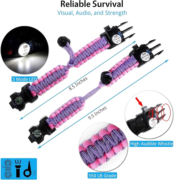 Survival Paracord Bracelet - Tactical Emergency Gear Kit with SOS LED Light, 550 Grade, Adjustable, Multitools, Fire Starter, Compass, and Whistle - Set of 2