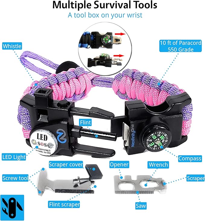 - MULTITOOLS - This survival bracelet set includes a pair of compact multi tools that fits neatly inside the buckle. The tool has screwdriver, scrapper, saw, wrench and more!