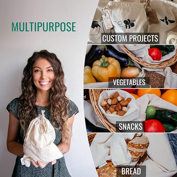 - Eco-Friendly - No more plastic. Use this organic, 100% Biodegradable Cotton/Muslin storage bag with a smooth and delicate fabric, which allows for air circulation. Easy to care for. No toxic chemicals were used while weaving the muslin fabric bags.