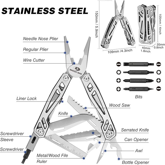 MOSSY OAK Multitool, 21-in-1 Stainless Steel Pocket Knife with Screwdriver Sleeve, Self-locking Pliers with Sheath-Perfect for Outdoor, Survival, Camping, Hiking, Simple Repair