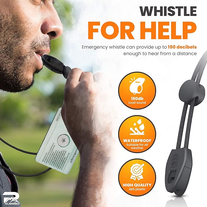 - 🆘 CALL FOR HELP - Our outdoor survival kit comes with two signaling mirrors for far-reaching communication outdoors. Each mirror comes with a water-wicking whistle which produces 150 dB loud sounds.