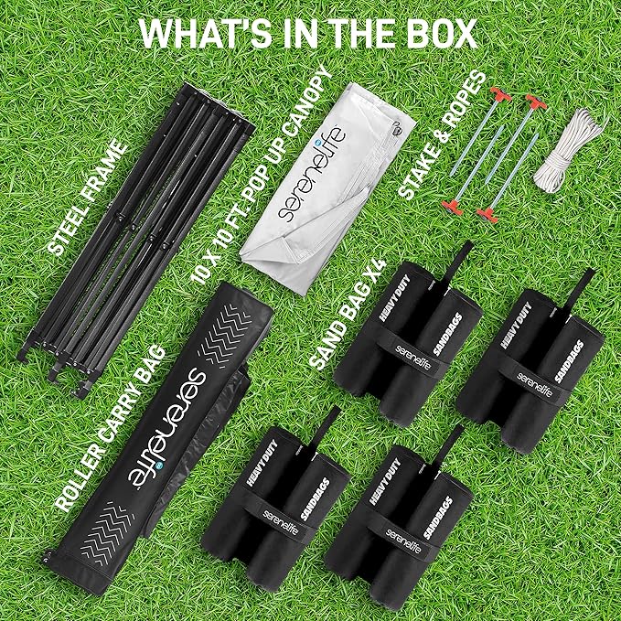 - 100 SQUARE FEET: SereneLife covered tent canopy has a total assembled size of (LxWxH) 120" x 120" x 133" –inches and provides 100 square feet of shade. Can cover 4 tables, 3 beach chairs and 10 people at the same time