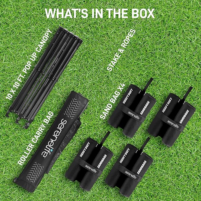 - WHEELED CARRY BAG: This heavy-duty canopy set comes w/ wheel roller carry bag for portability and easy storage, (4) 35 lb sandbag, & stake & ropes. Perfect for beach, camping, backyard party, picnic, garden wedding event, outdoor sport & more