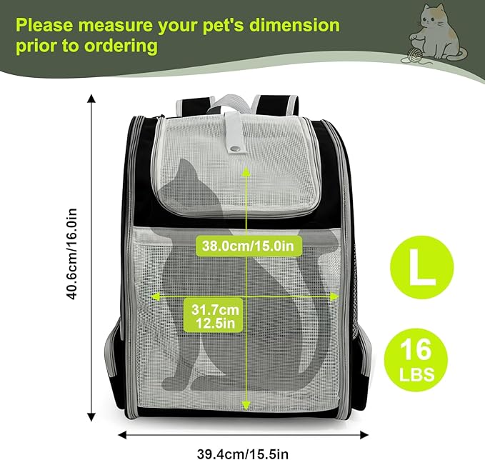 - Dimensions & Weight: 15.2" wide and 11.4" deep, 3 side mesh ventilation and extra two side pockets to keep personal stuffs like phone and keys, also pet's leash and treats. 16.5" tall pet backpack fits large cat and dog up to 16 pounds, entire backpack for pet is less than 3 pounds weight. Metal steel frame constructed with hard support base to ensure durability. Padded shoulder straps and back provides comfortable fit and extra chest buckle to prevent pet backpack from wiggling.