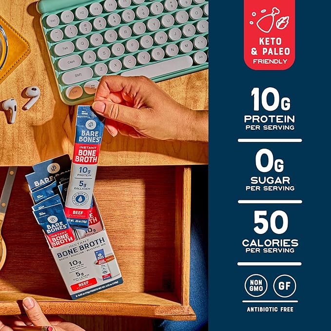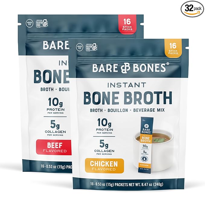 - AROMATIC DELICIOUS FLAVOR: Enjoy the taste and benefits of bone broth in convenient stick packs with Bare Bones Bone Broth Instant Powdered Mix. Made with real bone broth, pasture-raised chicken or grass-fed beef collagen, freshly ground herbs and spices, and more. Experience the deep, rich, savory flavor of real bone broth, crafted with quality ingredients that warm you from the inside out, wherever you are.