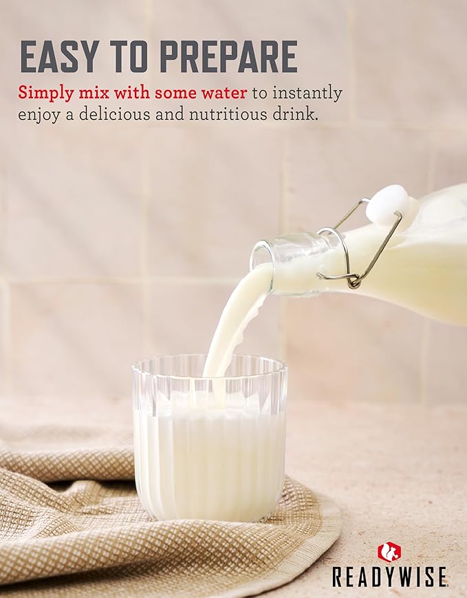- EASY PREP, FAST REWARD: Just add water to enjoy a nutrient rich mix of nonfat dry milk and sweet whey powder, made with premium ReadyWise ingredients in your camping kitchen, for survival meals, or whenever you need a quick, powerful drink on the go.