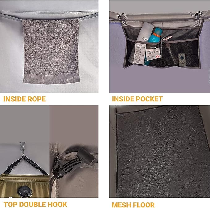 - SMART DESIGN WITH VENTILATION & STORAGE: Top and side mesh windows provide excellent airflow to keep things fresh. Dual ceiling hooks and side hooks support shower bags and heads, while inner mesh pockets, towel holders, and a clothesline keep everything organized. This Camping Shower Tent is built with your comfort in mind.