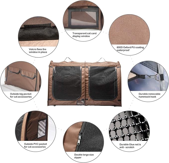 - NICE COMFORT - The oversized two-compartment structure provides a spacious and comfortable space for your kitten. Inside the cage, the structure is divided into two symmetrical parts, including a zippered Oxford cloth door separating the two sides. Above each part is a detachable fine and comfortable flannelette hammock, and below is the same flannelette mat. Your cat can rest and play in this happy nest, and we also have a foldable litter box, which is as complete as an apartment.