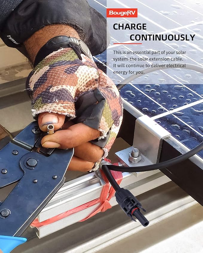 - UPGRADE 2.0 SOLAR CABLE: Increase a pair of separate solar connectors. One pair ( 1 piece black + 1 piece red ) 10 Feet 12AWG Solar Extension Cable. Made with copper.