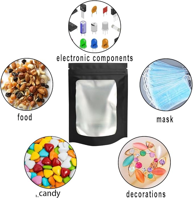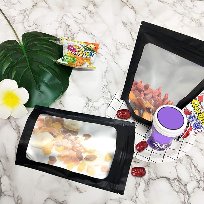 - STAND-UP MYLAR BAGS WITH CLEAR WINDOW - You will get 100 Pcs smell proof bags with clear window, allows you to check the food situation easily, the mylar bags can heat sealable, you can heat seal the open top section above the zipper for extra protection.