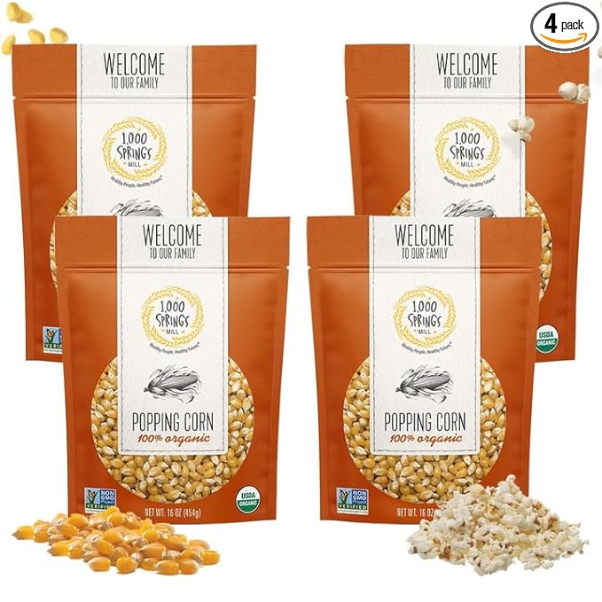 1000 Springs Mill Organic Dry Popcorn Kernels - Non-GMO, Healthy Snack for Microwave or Stovetop - Bulk Organic Popcorn Kernels with Resealable Bag - Enjoy Fresh & Crisp Popcorn - 16oz (Pack of 4)