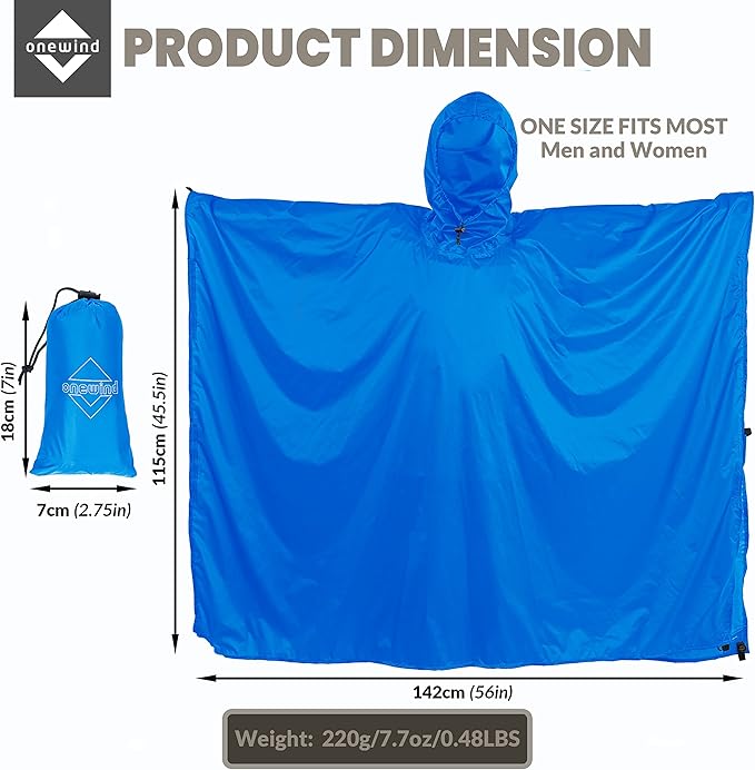 - DURABLE AND RELIABLE. Whether you are heading out for a backpacking trip, hiking, fishing trip or camping, make sure that you stay dry and comfortable with Onewind's Rain Poncho for adults. It's made from 1.1oz Silnylon Ripstop that is waterproof and tear-resistant so you can get the most out of this rain gear.