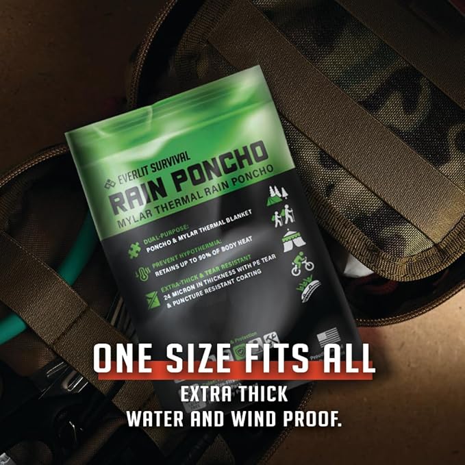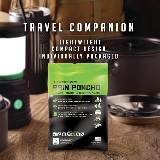 • 4 Pack Rain Ponchos for Adults- Durable and reusable aluminized thermal blanket poncho with PE tear and puncture-resistant coating, field-tested by veterans. Everlit Survival Mylar emergency ponchos are perfect survival gear and equipment for maintaining user's body heat.