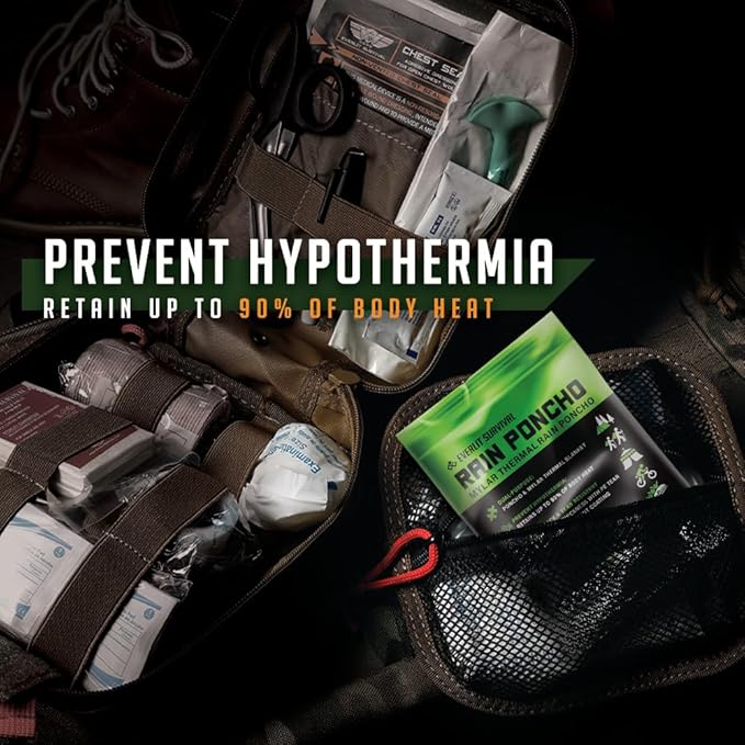 • HYPOTHERMIA RESCUE ESSENTIAL- Perfect for emergency situations where warmth or protection from inclement weather conditions is required. such as, sudden weather change, disaster, earthquake, rain, snow, hail and other. These insulation rain poncho make you safe or safer from cold winter extreme weathers and prevent hypothermia and shock by retaining up tp 90% of the body heat.