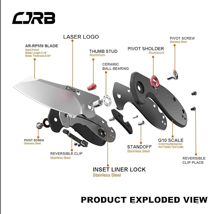 - Exceptional Blade Quality: This CJRB pocket knife boasts a premium AR-RPM9 steel construction, offering unparalleled edge retention and an extraordinary hardness of HRC59-61. This guarantees lasting durability and razor-sharp precision. Paired with a G10 handle renowned for its durability, moisture resistance, and temperature resilience, you'll experience unparalleled comfort and control. Its ergonomic design ensures effortless handling, even during prolonged use. From everyday tasks to demanding challenges, this pocket knife excels in versatility and reliability.