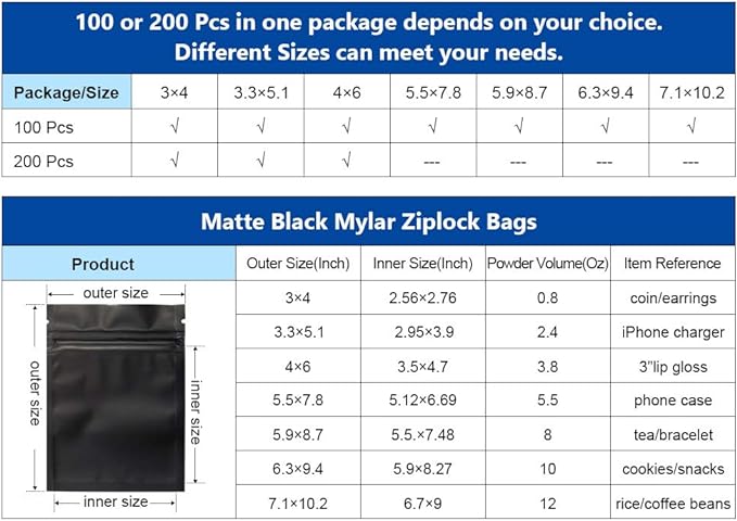 - SIZE: Outer size is 10 x 15 cm/ 4 x 6 inches, inner size is approx. 9 x 12 cm/3.5 x 4.7 inches, you will get 200 pcs resealable smell proof bags, foil bag pouch will protect your goodies against dry climates whether.