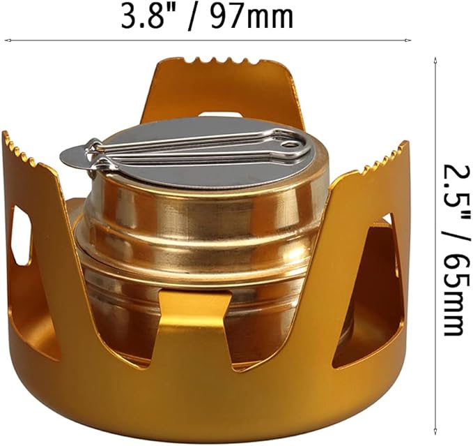 - Stove Size:7.4*7.4*4.6cm/2.9“*2.9”*1.8“,Weight:37g/1.3oz. Support Size:9.7*9.7*6.5cm/3.8"*3.8"*2.5", Weight:107g/3.7oz.Material: Aluminium alloy stove stand and brass stove, the base with wind screen which can keep the stove stable and support pots and pans.