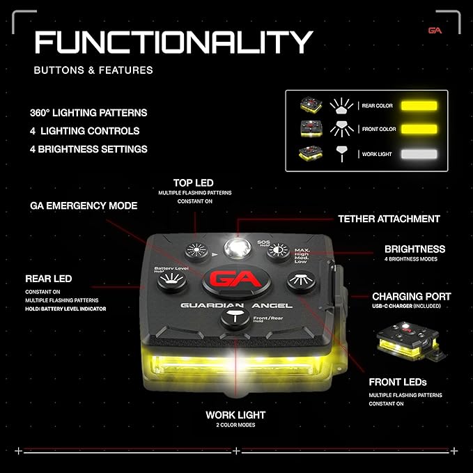 - 𝗠𝗮𝘅𝗶𝗺𝘂𝗺 𝗩𝗶𝘀𝗶𝗯𝗶𝗹𝗶𝘁𝘆: With 14 high-output LEDs, the Guardian Angel Micro Series keeps you visible from up to 3+ miles. With 360° lighting, others can see you from all sides. Four brightness settings, multiple flash patterns, steady burn option and Emergency Mode, ensure others can see you when needed. This device features 6 yellow LEDs on the front, 6 yellow LEDs on the rear, a single white work light, and a white top light.