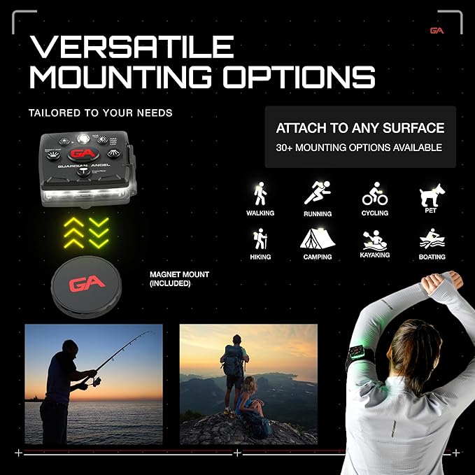 - 𝗩𝗲𝗿𝘀𝗮𝘁𝗶𝗹𝗲 𝗠𝗼𝘂𝗻𝘁𝗶𝗻𝗴: Each Micro device features a built-in rare-Earth magnet that works with all GA mounts as part of the patented Magnet Mounting System. Securely attach to clothing with included magnetic mount, or secure in seconds to your bike, helmet, dog collar, leash, stroller, backpack, tent, vehicle and more with the purchase of activity-specific mounts. Two built-in screw mounts add extra security. One light offers 1,000s of uses and can be mounted to anything.