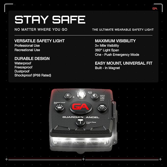 - 𝗠𝗮𝘅𝗶𝗺𝘂𝗺 𝗩𝗶𝘀𝗶𝗯𝗶𝗹𝗶𝘁𝘆: With 13 high-output LEDs, the Guardian Angel Micro Series keeps you visible from up to 3+ miles. With 360° lighting, others can see you from all sides. Four brightness settings, multiple flash patterns, steady burn option and Emergency Mode, ensure others can see you when needed. With 6 white LEDs on the front, 6 red LEDs on the rear, this device features a hands-free white flood light, a white work light, and a white top light.