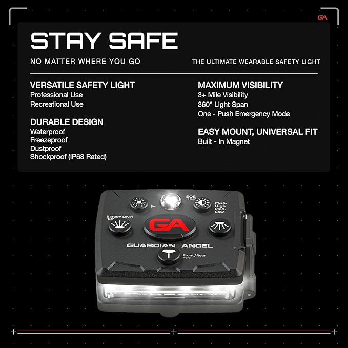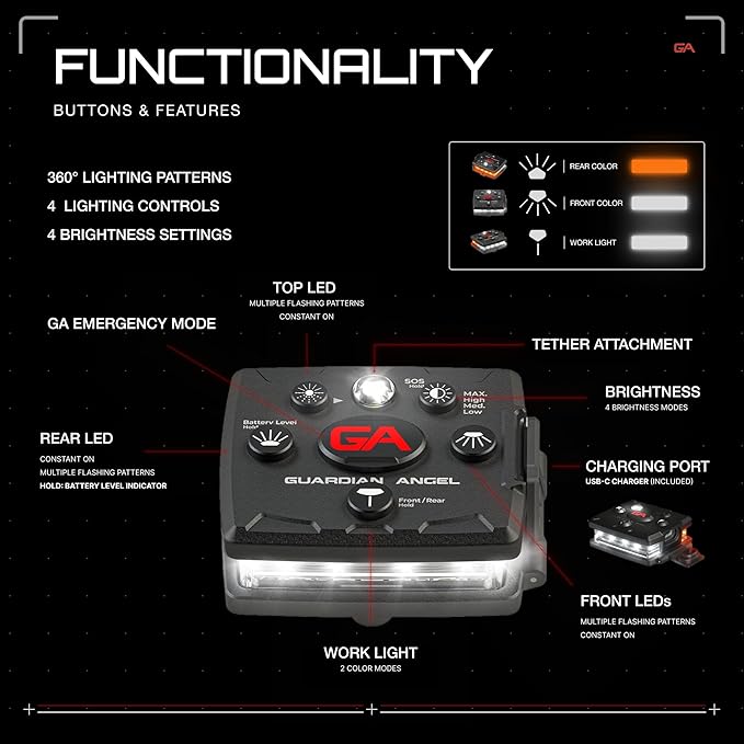 - 𝗠𝗮𝘅𝗶𝗺𝘂𝗺 𝗩𝗶𝘀𝗶𝗯𝗶𝗹𝗶𝘁𝘆: With 13 high-output LEDs, the Guardian Angel Micro Series keeps you visible from up to 3+ miles. With 360° lighting, others can see you from all sides. Four brightness settings, multiple flash patterns, steady burn option and Emergency Mode, ensure others can see you when needed. With 6 white LEDs on the front, 6 orange LEDs on the rear, this device features a hands-free white flood light, a white work light, and a white top light.