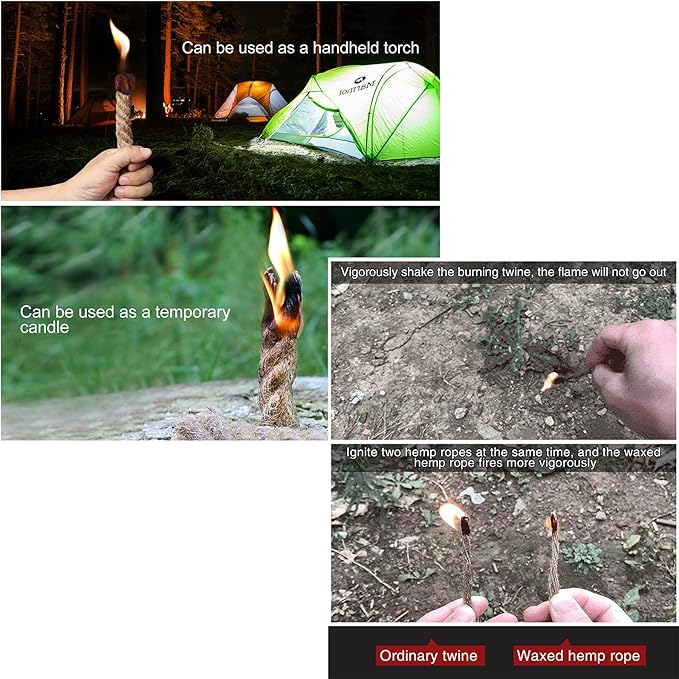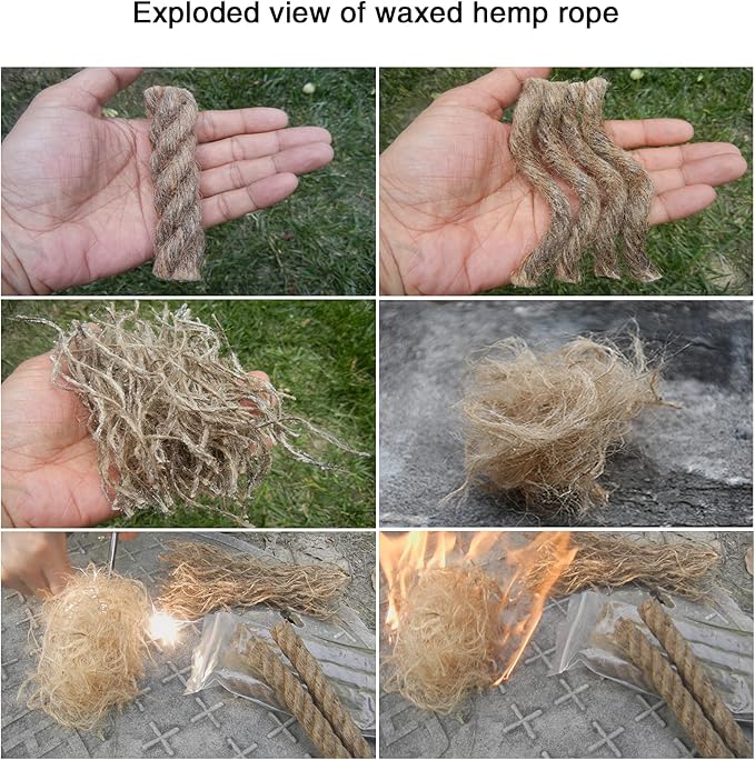 - How to use: One method, as shown in the figure, twist the hemp rope into filaments, and then use fire starter sticks or ferro rod, flint, match, and lighter to ignite the waxed hemp rope as an igniter. Another method is to directly light the twine, It can temporarily be used as a torch or candle.