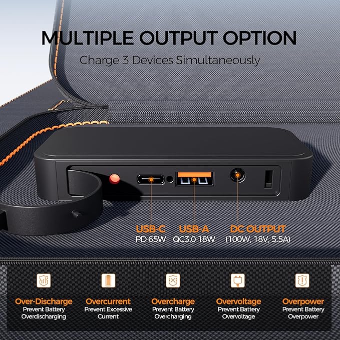 - [ 3 Outputs ]: The solar panel features with 1*USB-C(65W), 1*USB-A(18W) port and 1*DC Output.Charging multiple devices at the same time, such as smartphones and tablets, GPS, digital cameras, etc. Ideally suited for outdoor life and even unexpected power outages.
