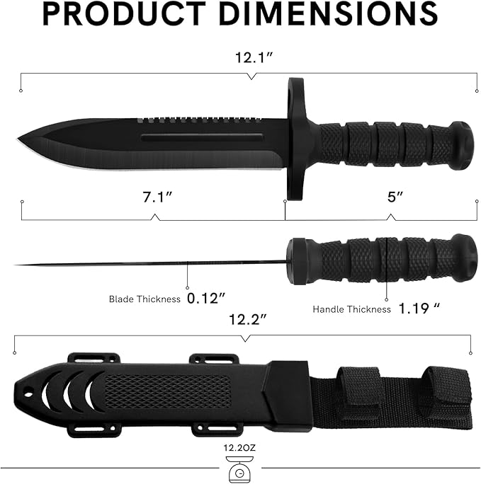 - 12 Inch Fixed Blade Hunting Knife: Ultra-sharp combat knife, stronger than any hunting knife or a bowie knives. Overall Length: 12 inch; Blade Length: 7.1 inch; Blade thickness: 0.12 inch; Weight: 14.4 oz