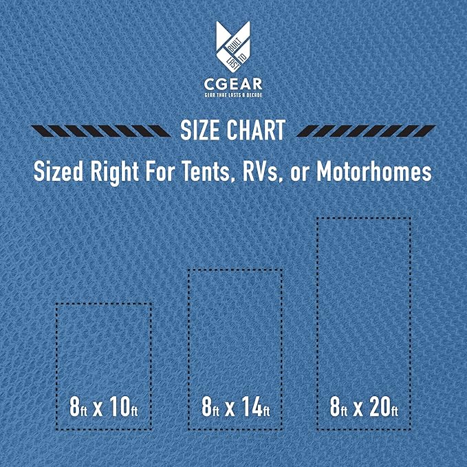 - Extra-Soft Sandfree Technology: RV camping adventures are even better with a little luxury. CGEAR’s permeable, UV-safe Comfort mats offer both toughness and softness. We incorporate our unique sandfree weave for the bottom layer, allowing wind, soil, grit, and sunlight to whisk through—while the top fabric is soft & gentle like your favorite comforter. Arrange it outside your RV, motorhome, camper, or popup for a cheerful & welcoming patio setting.