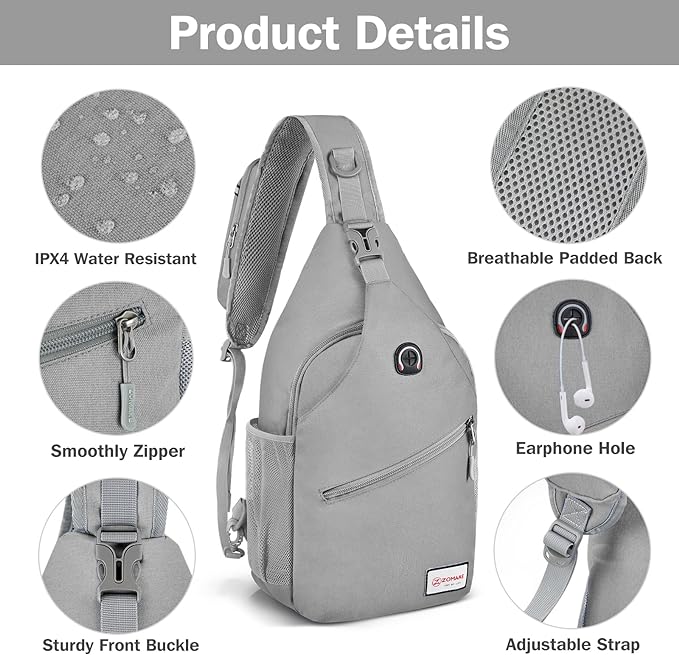 ZOMAKE Sling Bag,Small Crossbody Sling Backpack,Water Resistant Shoulder Daypack for Travel,Anti Thief Chest Bag for Hiking(Grey(New))