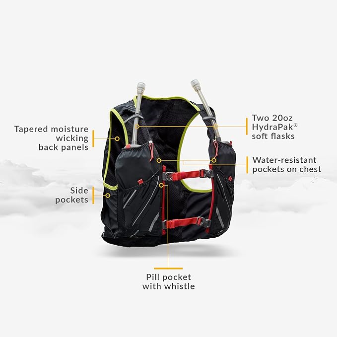 - ESSENTIAL DESIGN: Made of moisture wicking tapered back panels & chafe free. New side pocket for easy access, new vertical pocket for larger items, and two 20oz hydration Soft flasks with ExoSpine for stability, long hose and mouthpiece.