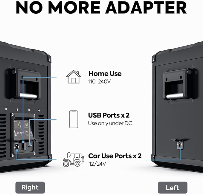 - Convenient Plugs - 12/24V DC ports are installed on both sides of the fridge. 2 USB outlets designed for charging mobile devices (Only available under DC Power). Built-in AC transformer allows you to pre-cool the fridge from your home socket 110-240V.