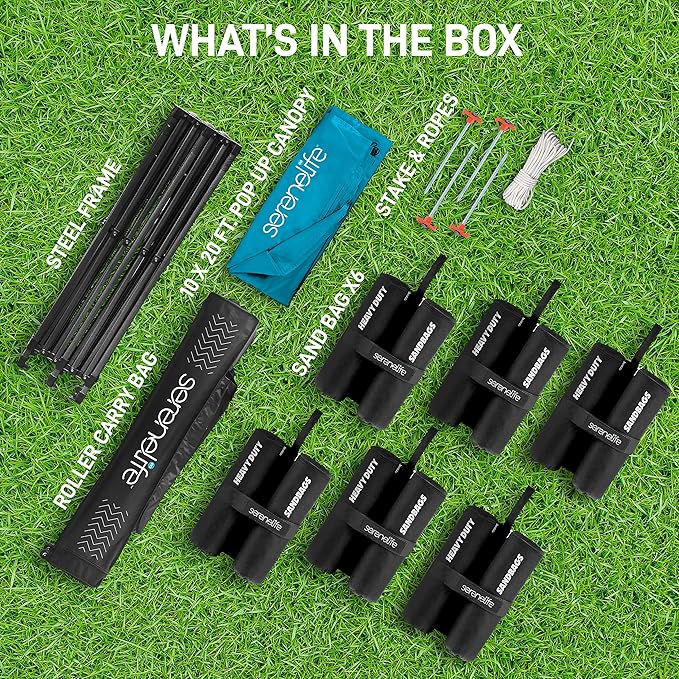 - WHEELED CARRY BAG: This heavy duty canopy set comes w/ wheel roller carry bag for portability and easy storage, (4) 35 lb sandbag, & stake & ropes. Perfect for beach, camping, backyard party, picnic, garden wedding event, outdoor sport & more