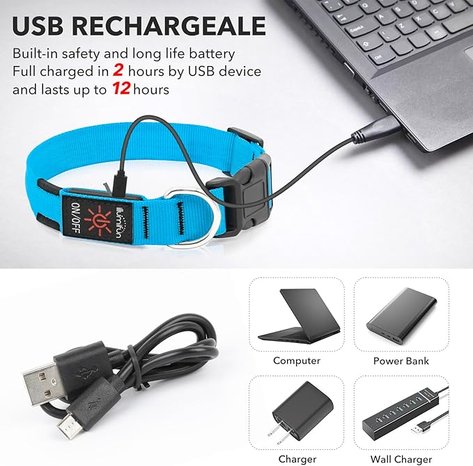 Illumifun LED Dog Collar, USB Rechargeable Light Up Collar Glow in The Dark, Adjustable Safety Pet Light for Your Pups Walking at Night (Blue, Small)
