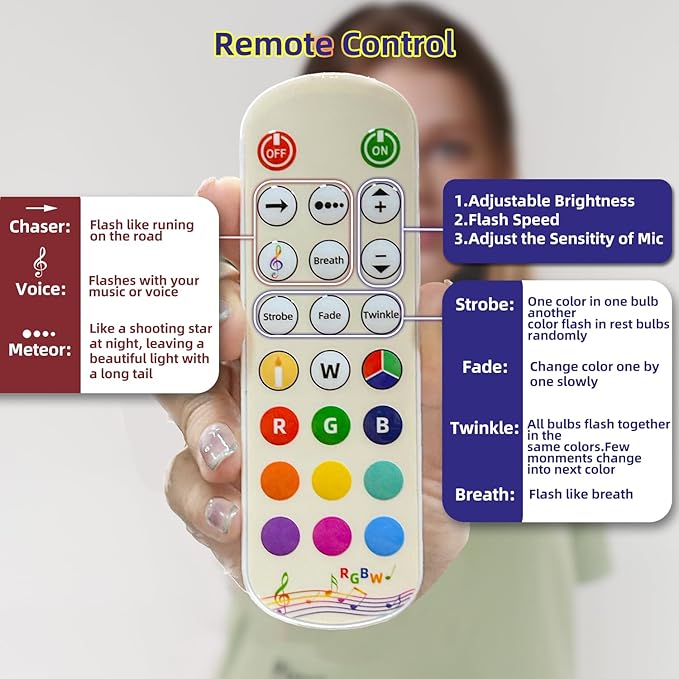 - MUSIC COLOR CHANGE: You only need to press the voice button on the remote control, Colourful Outdoor String Lights will turn on the music color change function, it will automatically change the color according to the music or ambient sound, it is the perfect atmosphere maker, the best for your holiday party Good partner.
