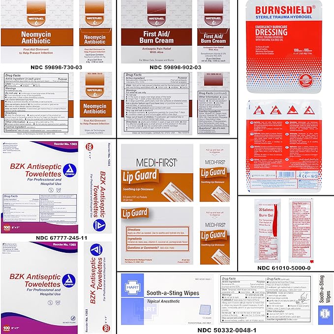 - Included Components : 5 Junior Bandages 3 Patch Bandages 3 Spot Bandages 16 Fabric Bandages 1x3 3 Butterfly Closures 3 Fingertip Bandages 3 Knuckle Bandages 2 Oval Eye Pads 1 Adhesive Tape 1/2 2 Gauze Pads 2x2 2 Gauze Pads 3x3 2 Gauze Pads 4x4 2 Non Adhering Pads 2x3 2 Combine Pads 5x9 1 Gauze Roll 2 Inch 2 Pair Nitrile Gloves 1 Tweezer 1 Burn Dressing 4x4 1 CPR Mask 2 Burn Gel Packets 1 Bandage Scissor 2 Non Aspirin Packets 2 Antacid Packets 2 Diphen Packets 2 Ibuprofen Packets 2 Pain Relief Packets 2 Sinus Tab Packets 3 Antiseptic wipes 3 First Aid Burn Cream 3 Hydrocortisone Cream 3 Antibiotic Ointment 3 PVP Pad 1 Bug X Wipe 3 Lip Guard Packet 1 Ivy Cleanse Wipe 1 Electrolyte Packet 2 Sunscreen Packet 3 Sting Relief 1 Rolled SPlint 1 Rescue Blanket 1 Triangular Bandage 1 Cold Pack 1 Elastic Wrap 1 Blood Stopper Bandage 1 Compressed Gauze 4 inch 1 Swat T Tourniquet 1 Celox Bleed Control Packet 5 Junior Bandages 3 Patch Bandages 3 Spot Bandages 16 Fabric Bandages 1x3 3 Butterfly Closures 3 Fingertip Bandages 3 Knuckle Bandages 2 Oval Eye Pads 1 Adhesiv… See more