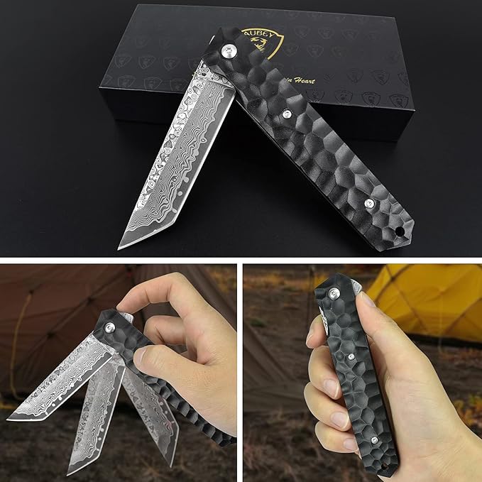 - HIGH QUALITY: AUBEY Damascus steel blade knife combined with 33 layers of high carbon steel and 33 layers of low carbon steel and VG10 steel. The folding knife for excellent cutting performance and corrosion resistance, nice fit, and finish as a superb slicer for your EDC use or collection