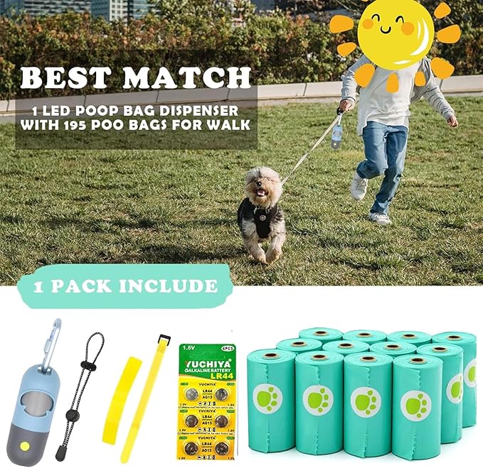 - PEFECT MATCH FOR DOG WALKING: The package contains 1 led dispenser,15 poop bags enough to keep you safe without worrying about shortage,3 kinds of hooks and 6 extra button batteries.This is the great equipment for those of you who love to walk your dog that is convenient and economical