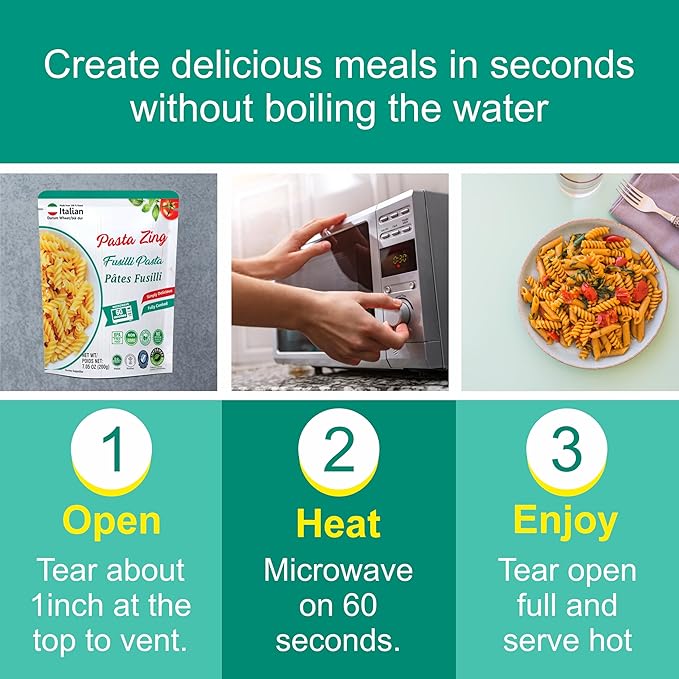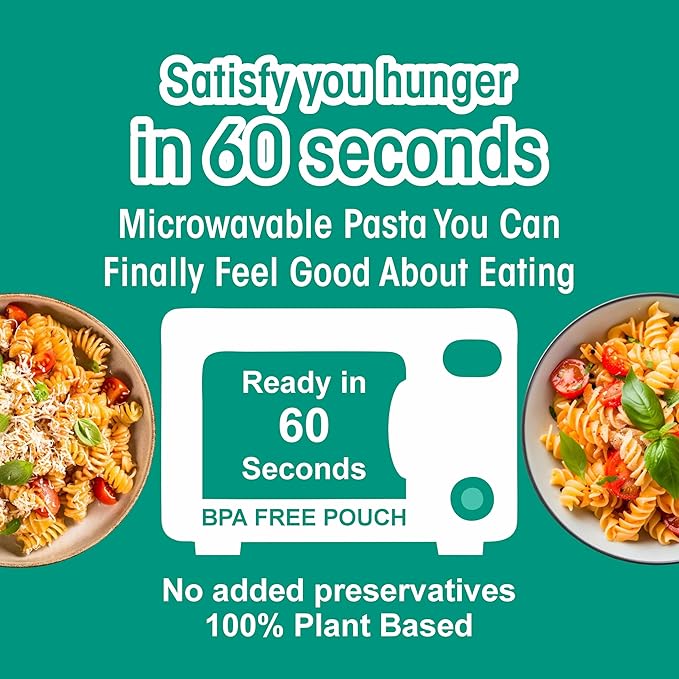 - READY IN JUST 60 SECONDS: Enjoy hot, delicious microwavable fusilli pasta in just 60 seconds. Whether you're meal prepping, running late for work, or feeding kids after school, this instant pasta is always ready to go. Perfect for busy days when you want quick meals without giving up flavor or nutrition.