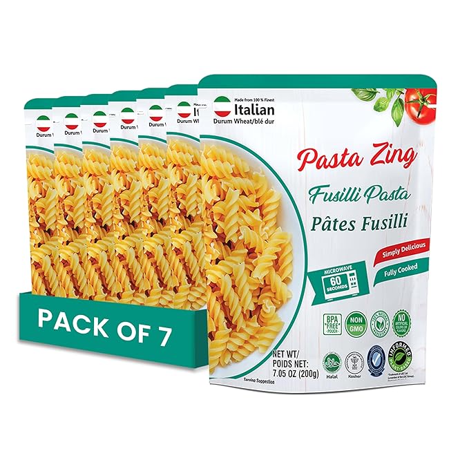 Pasta Zing Fusilli Pasta – Fully Cooked Spiral Pasta, Microwaveable in 60 Seconds, Made with 100% Italian Durum Wheat, Non-GMO, Halal & Kosher Certified, No Preservatives – 7.05 oz (Pack of 7)