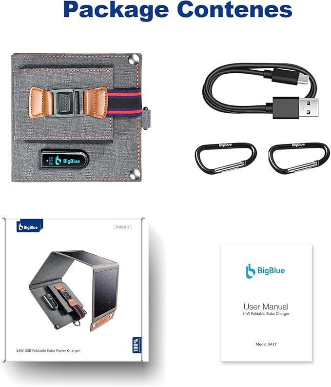- Included Components : 1x 14W Solar Charger, 1x USB-A to USB-C Cable, 2x Carabiner