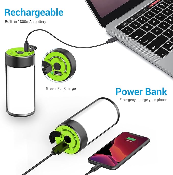 - 【Rechargeable Camping Lanterns】These camping lights for tents are rechargeable, they can be fully recharged via the USB cable for around 2 hours, then one light can last 3-10 hours, more convenient and eco-friendly than other lanterns which need AA batteries. Our camping lantern has also built-in a USB output port and a 1800mAh battery that allows charging a mobile phone in emergency situations.