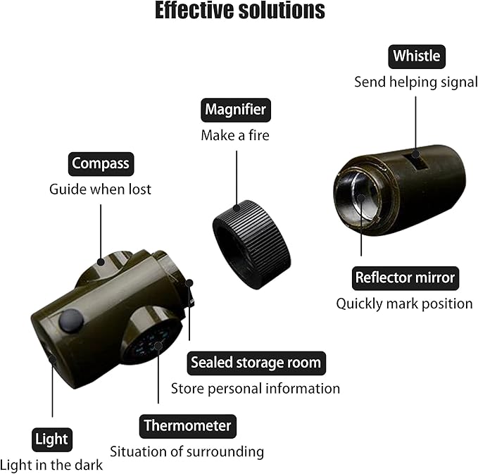 - Included Components : Compass, Mirror, Survival Whistle, Thermometer, Whistle