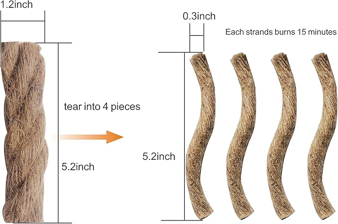 - 【Includes Waxed Tinder Cord – Thick or Thin Options】 Thick Rope (1.2" x 5.2"): 4 strands, ~15 min burn per strand Thin Jute Cord (0.3" x 1.2"): 20 pieces, ~5 min burn each All tinder is eco-friendly, odorless, and lights easily with a match or ferro rod.